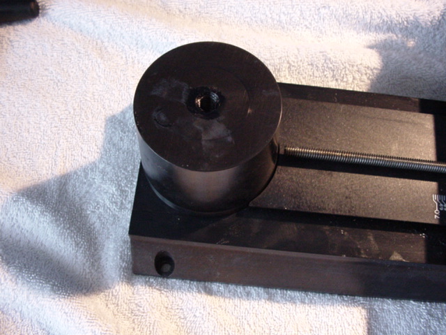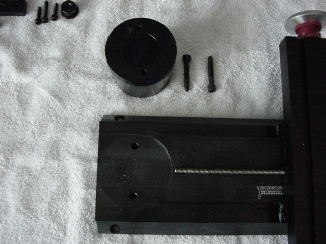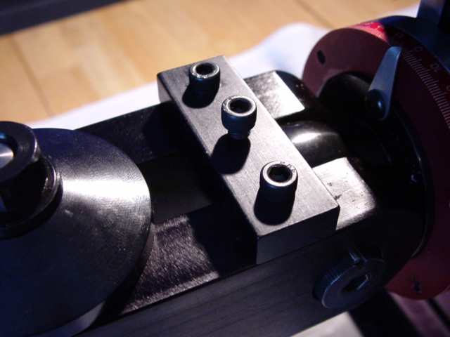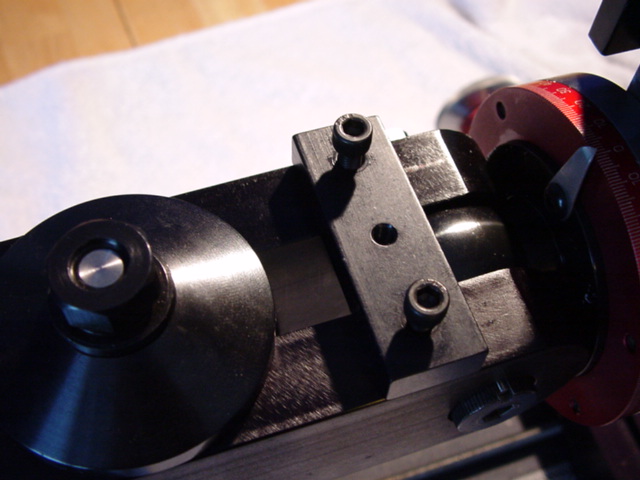 Next, put on the column adjustment block. This locks the column so that it cannot tilt front/back, and lets you make a fine adjustment to its orientation. You'll also want to use the 4 outer hex bolts to tighten up the column rotation axis so the whole thing doesn't flop around, and the 4 inner bolts to lock the vertical column bed to the rotary column (the big red dial).