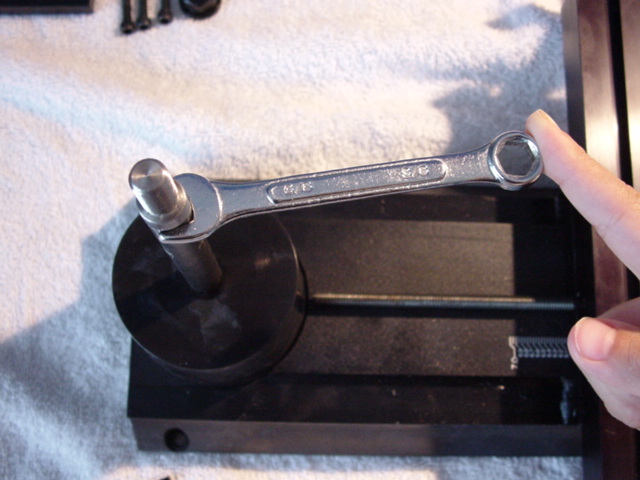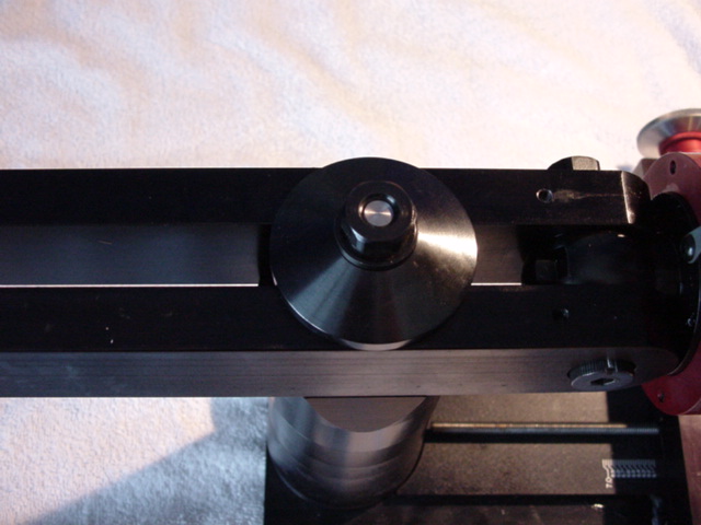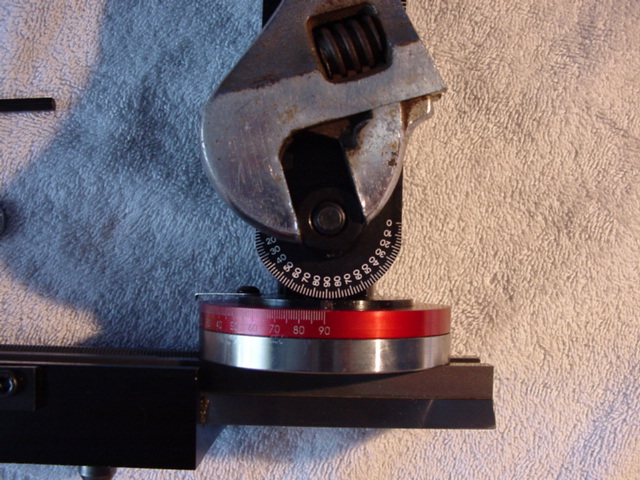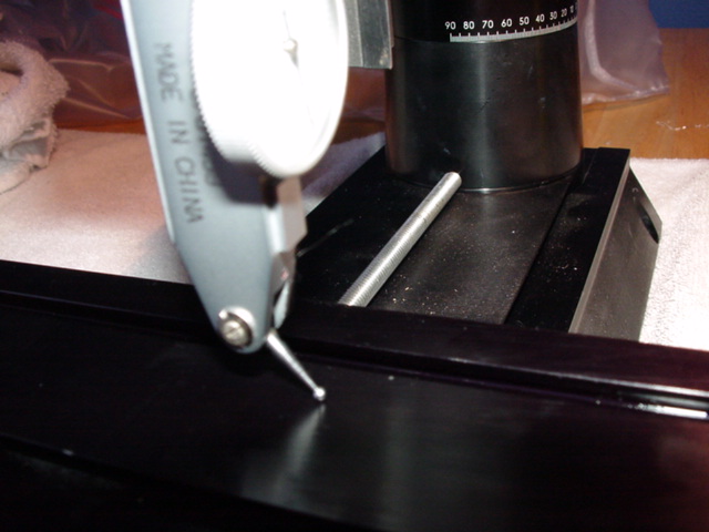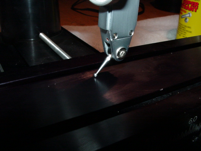 Next we'll adjust the pitch axis, freeing the knuckle by loosening the flange bolt behind the rotary column dial, and doing fine adjustment with that central bolt. Read the instructions carefully, and realize that because the front and back points you are measuring are both in front of the pivot, their positions will change in the same direction but different amounts. All you care about is getting them to the same value, so: