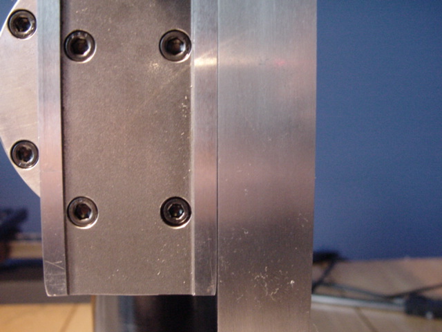In a similar way, you adjust the rotary column. I aligned against the sharp edge of the column bed, as it was hard to see if things were correct any other place (but, see below). To adjust, you loosen the 4 outer bolts on the front plate, and rotate to things line up. I found it easiest to actually do it by feel, using the machinist's square to hold the column bed in the right orientation while I tightened the bolts down.