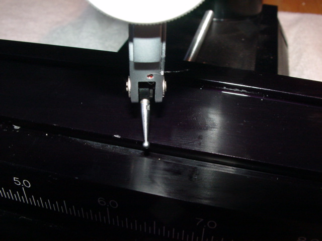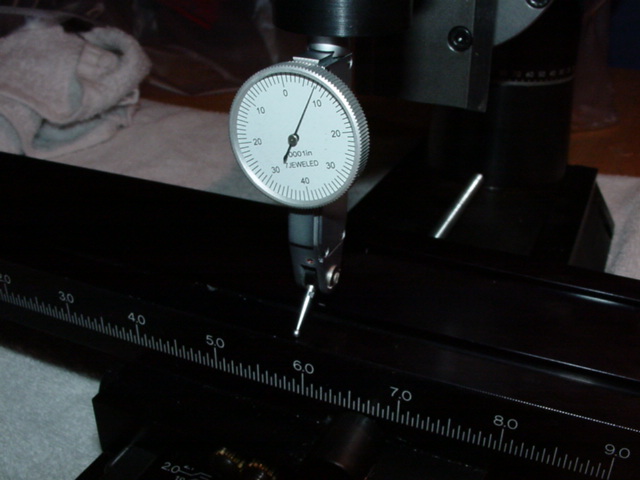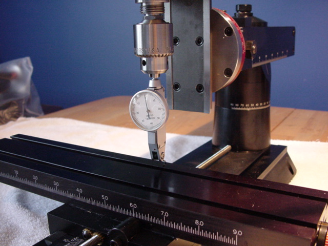 Then, using the Y axis knob at the front of the mill, move the saddle towards the back until the dial indicator tip is almost at the front of the saddle, and record the variation in the readiing. I got a reading of +16 at the center of the saddle and +10 (1/1000th of an inch) at the front, as compared to the back. This is at the low end of the range Sherline mentions.