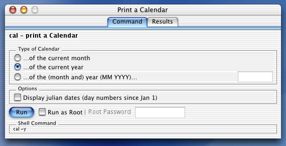 ShellShell is a scriptable application that can do just this - provide a friendly OS X user interface to any UNIX command. For example, the calendar command looks like this…