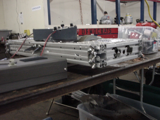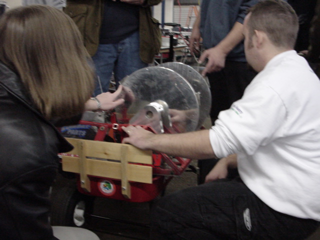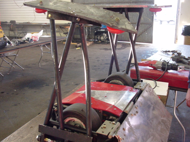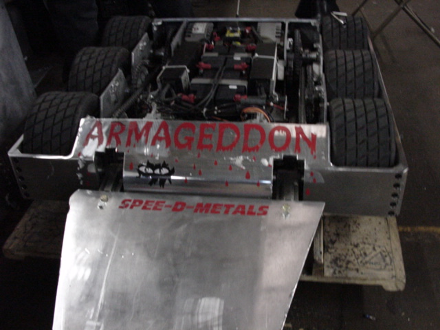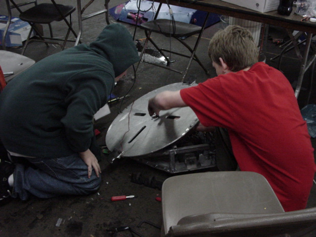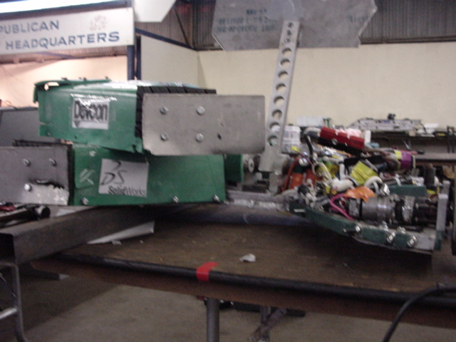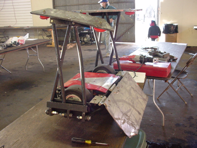 Although Red Menace went 0-2, some valuable lessons were learned. In the first fight, one of the battery connectors came loose and we lost half our power, which then caused radio problems. After jury-rigging alternate power connections, we had an exciting second fight, surviving being flipped (we were not invertable because we were close to our weight limit) and delivering a mighty whack that bent the other robot but, alas, screwed up the receiver power link I'd cobbled together. Oh well…